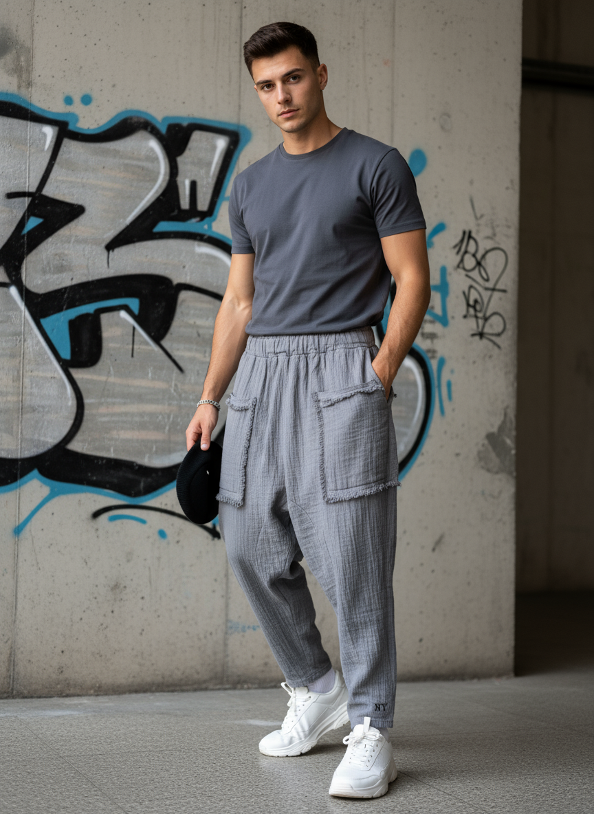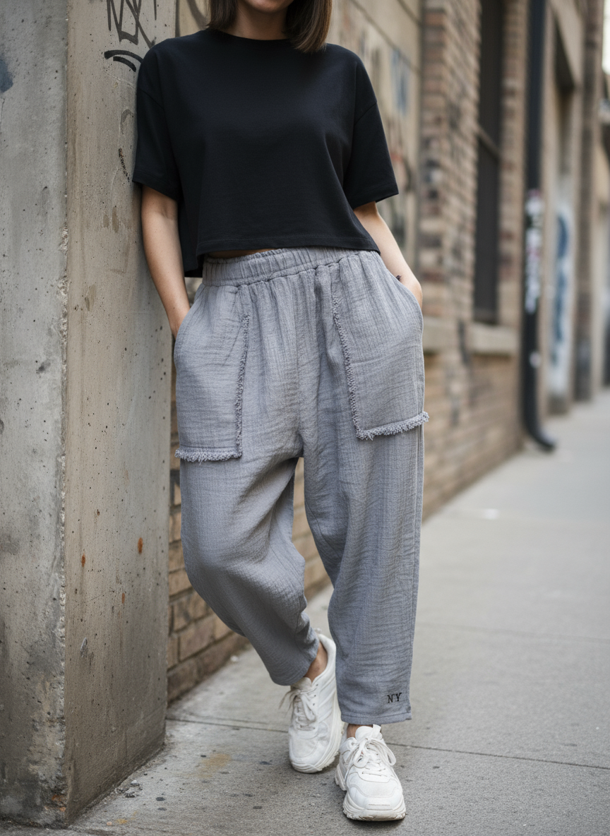 100% Organic Cotton, extra soft, oversized relaxed fit pant. This piece features big front pockets with elastic waistband.
